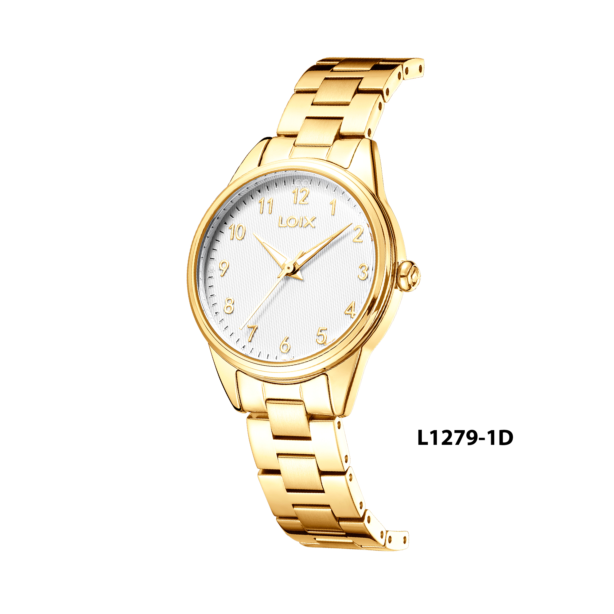 Este reloj de pulsera marca LOIX, referencia L1279, destaca por su diseño clásico y elegante en un acabado totalmente dorado. Presenta una caja redonda que enmarca un dial blanco con una delicada textura de líneas verticales, complementado por números arábigos y manecillas tipo espada en tono oro que facilitan la lectura. El conjunto se completa con un robusto pulso de eslabones de tres filas en acero dorado, cuyo brillo resalta su estilo sofisticado, ideal tanto para ocasiones formales como para el uso diario.