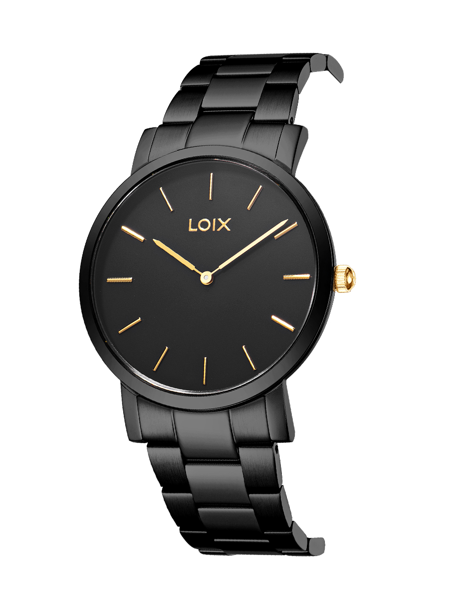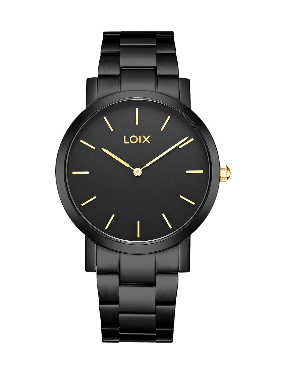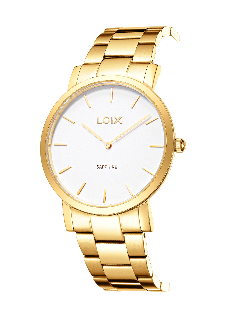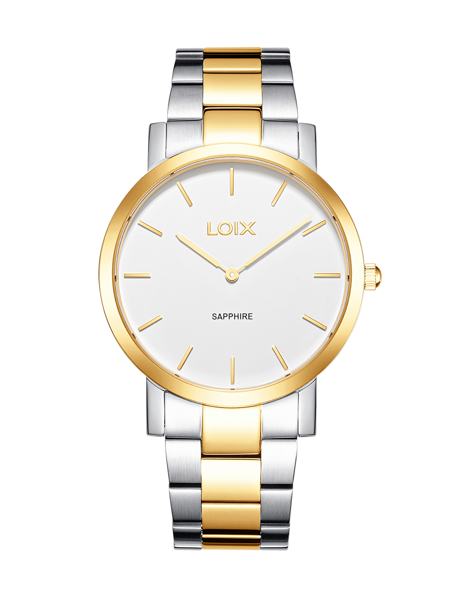 Este reloj de la marca LOIX destaca por un diseño monocromático de estética minimalista, donde la caja circular y el brazalete de eslabones comparten un acabado metálico uniforme y brillante. Su esfera despejada presenta delgados marcadores lineales que armonizan con las manecillas tipo bastón, resaltando la inscripción «Sapphire» que garantiza la alta resistencia de su cristal. La pieza proyecta una elegancia sobria y lujosa, lograda mediante la transición fluida entre las superficies pulidas de su estructura y la textura cepillada de su correa integrada.