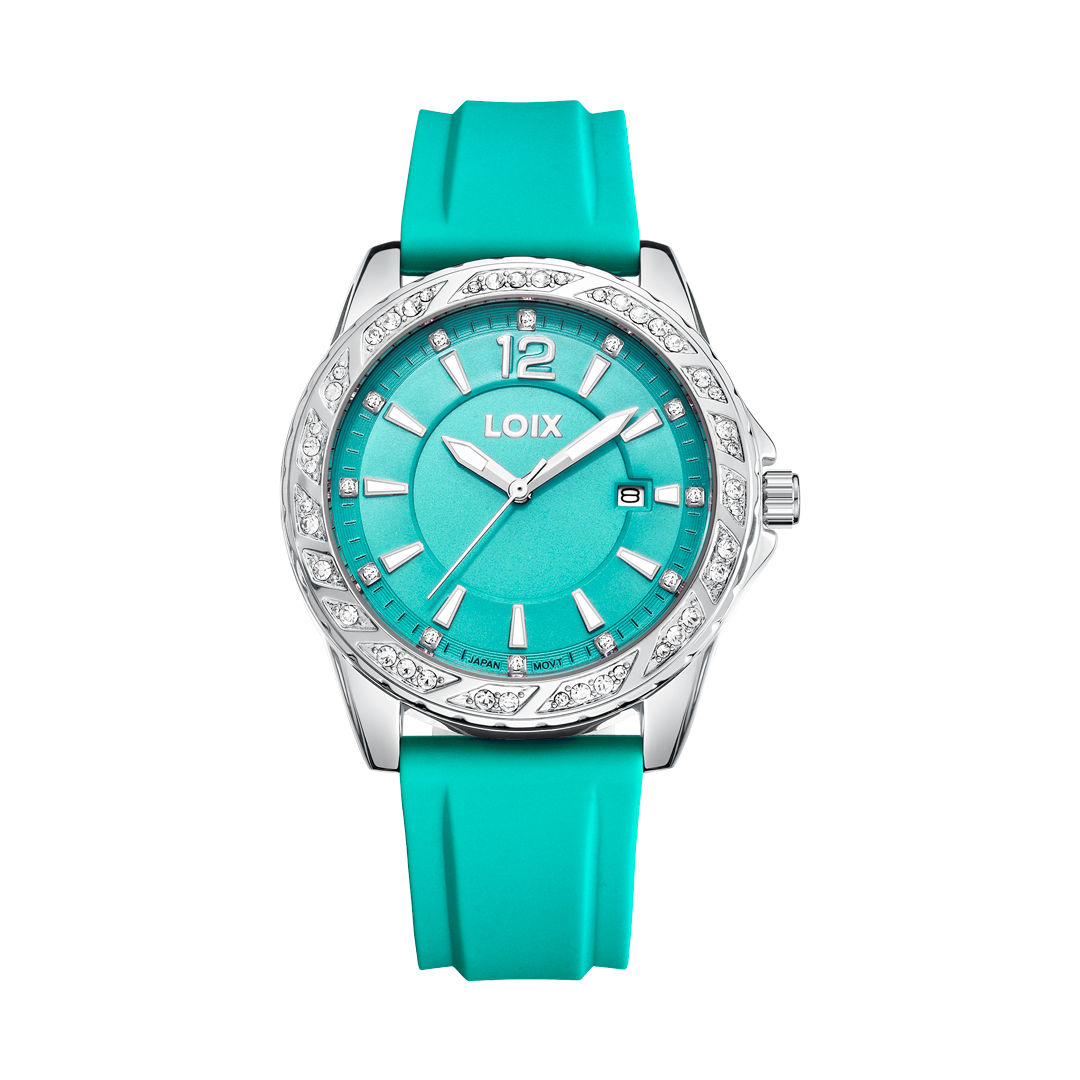 Este vibrante reloj de la marca LOIX destaca por un diseño audaz y contemporáneo, protagonizado por una esfera con acabado de rayos de sol y un bisel de geometría intrincada que alterna superficies pulidas con incrustaciones de cristales brillantes. El dial presenta marcadores horarios facetados y una ventana de calendario a las tres, asegurando una lectura clara bajo cualquier circunstancia gracias a sus manecillas con detalles de alta visibilidad. Su estructura se completa con una correa de silicona flexible de textura suave que garantiza un ajuste ligero y ergonómico, convirtiéndolo en el accesorio ideal para quienes buscan una pieza con personalidad que combine la resistencia deportiva con un toque de elegancia moderna.