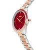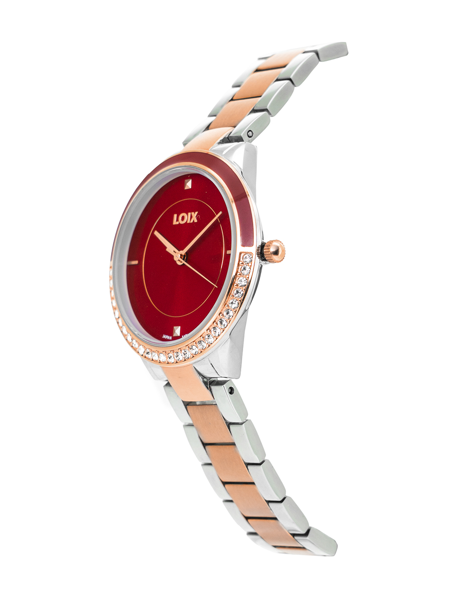 Este sofisticado reloj LOIX destaca por su vibrante esfera en tono borgoña con acabado cepillado, que crea un contraste elegante con su caja de acero plateado. El diseño se realza con un bisel decorado parcialmente por una hilera de cristales brillantes en la parte inferior y marcadores minimalistas tipo tachuela en las posiciones de las 12 y las 6. Su brazalete de eslabones combina armoniosamente el acero inoxidable con un camino central en oro rosa, logrando una apariencia femenina y lujosa que equilibra a la perfección el color intenso con el brillo de la pedrería.