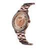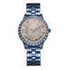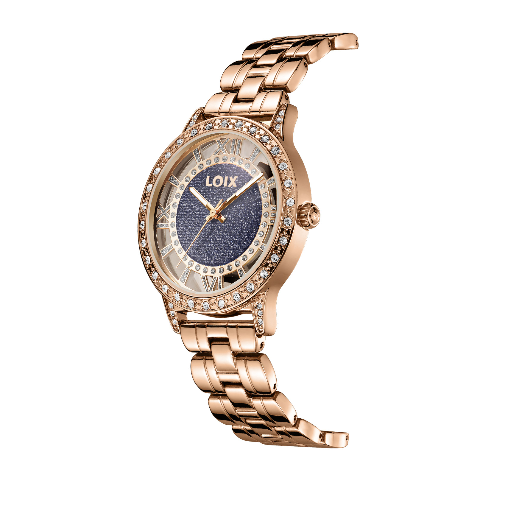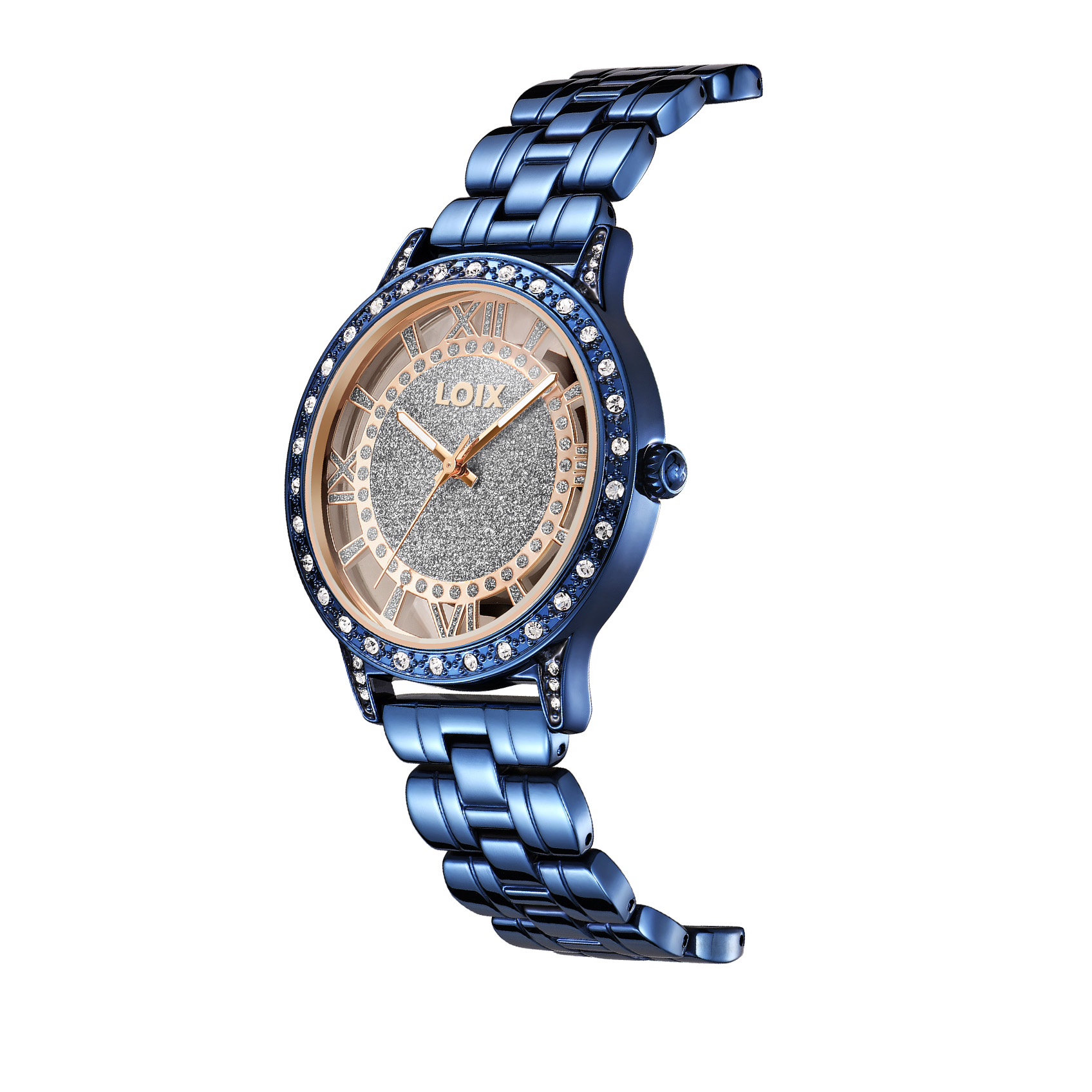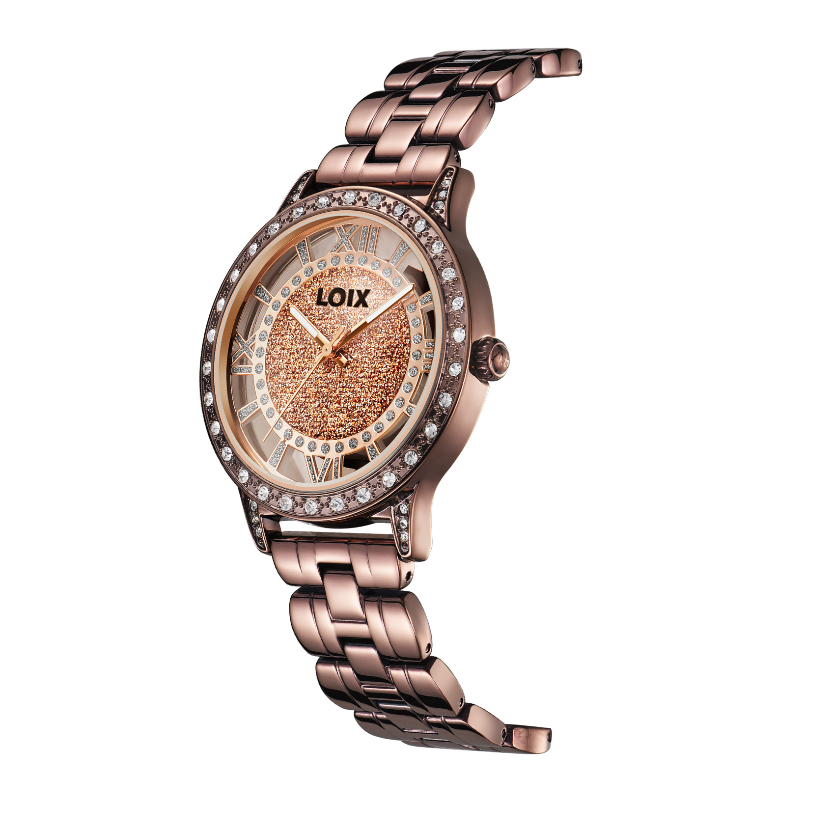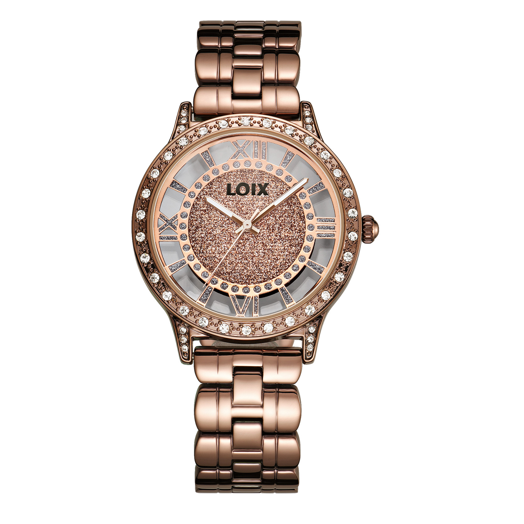 Este elegante reloj de la marca LOIX destaca por su diseño audaz y femenino, centrado en una esfera esqueletizada que permite ver a través de ella, rodeando un centro circular con acabado de escarcha brillante. Los marcadores de hora están representados por números romanos estilizados en un tono metálico que hace juego con las manecillas tipo espada, mientras que el bisel y las asas de la caja están lujosamente decorados con incrustaciones de cristales transparentes que aportan un brillo excepcional. Su brazalete de eslabones pulidos complementa perfectamente la estética sofisticada de la pieza, logrando un equilibrio ideal entre la joyería clásica y la relojería moderna.