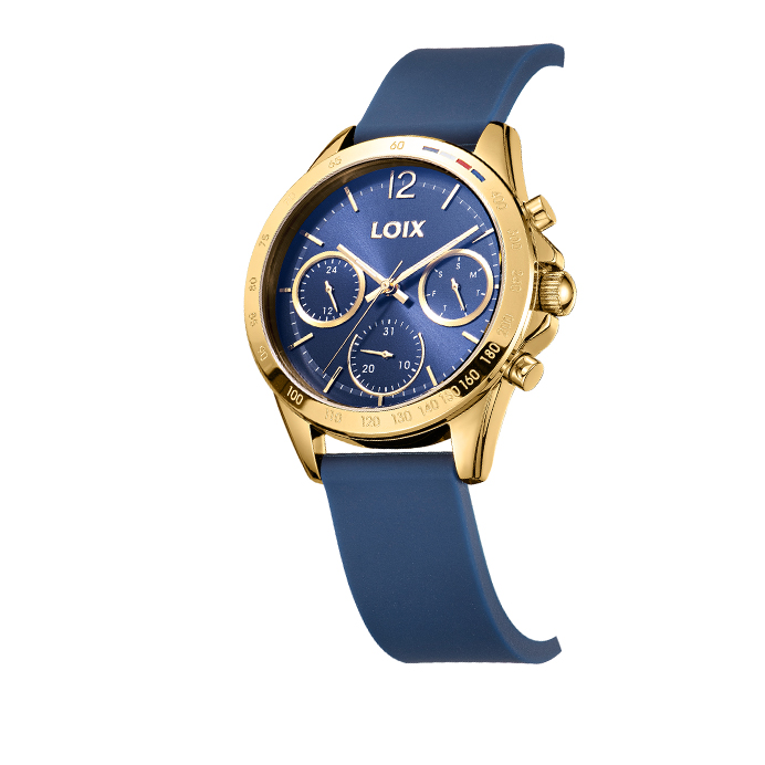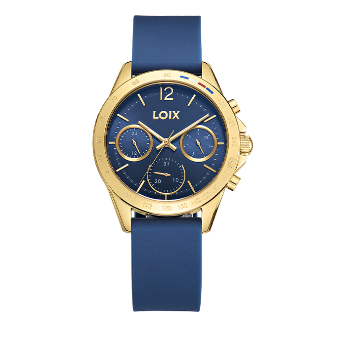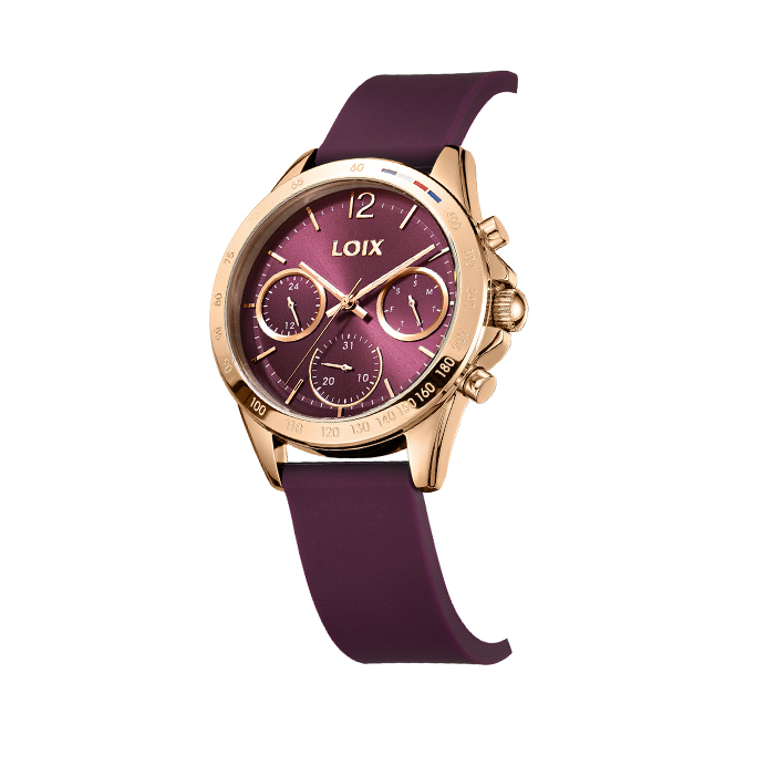 Este reloj LOIX fusiona un estilo deportivo y moderno con una paleta de colores sofisticada, destacando su esfera y correa de silicona en un profundo tono borgoña. La pieza cuenta con una caja que incluye un bisel con escala taquimétrica y sutiles detalles de color en la parte superior, enmarcando un dial multifunción con tres subesferas que indican el día, la fecha y el formato de 24 horas. El contraste entre la calidez del metal rosado y la textura mate de la correa lo convierte en un accesorio versátil, ideal para quienes buscan comodidad y elegancia en un diseño contemporáneo y dinámico.